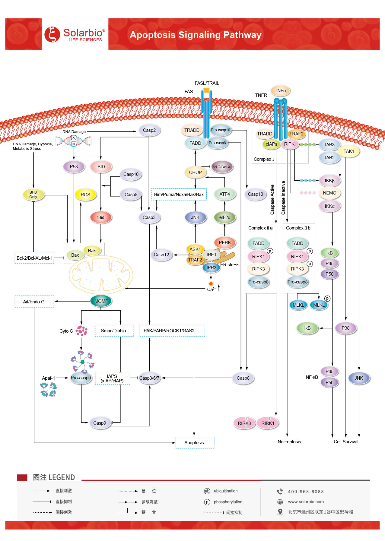 细胞凋亡常被看作是机体免疫反应过程或者细胞在遭受疾病或毒害过程中的一种自我防御机制。细胞凋亡是受多基因控制的一种编程性死亡,细胞凋亡的发生是由许多相互关联的过程控制的。“外源性"途径涉及分别通过其特异性配体,如TNF-α、FasL或TRAIL,刺激位于细胞表面的肿瘤坏死因子(TNF)受体亚家族成员,如TNFRI、CD95/Fas或TRALR(死亡受体)。“内源性"途径主要由非受体刺激激活,如DNA损伤、内质网应激、代谢应激、紫外线辐射或生长因子剥夺。“内源性"途径中的中心事件是线粒体外膜透化(MOMP),它导致细胞色素C的释放。这两个途径在效应caspase水平上汇合,如caspase-3和caspase-7。第三个主要途径是由CTL(细胞毒性T细胞)和NK(自然杀伤)细胞释放的细胞毒性颗粒成分(例如Perforin和Granzyme B)启动的。类似于caspases,Granzyme B在天冬氨酸残基后切割其底物,这表明该蛋白酶具有直接激活胱天蛋白酶家族成员的能力。正是促凋亡和抗凋亡信号之间的平衡最终决定了细胞是否会发生凋亡、存活或增殖。