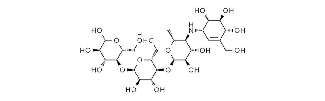 阿卡波糖(Acarbose)是一种复杂的低聚糖,以“葡萄糖-葡萄糖-葡萄糖"的三糖链为基础,在末端葡萄糖单元的C4位连接一个含氨基的环-己烯结构,形成独特的伪四糖结构。其来源大部分是人工合成的,是一种有效的α-葡萄糖苷酶抑制剂可用于调控血糖。
