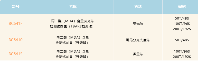 硫代巴比-妥酸反应物(TBARS)法是一种广泛用于检测丙二醛含量,筛选和监测脂质过氧化的方法。在酸性和高温的条件下,MDA可以与硫代巴比-妥酸(Thiobarbituric acid,TBA)反应生成棕红色的三甲川,该物质与MDA含量成正比,据此即可计算样本中的MDA含量。推荐使用索莱宝BC641F 丙二醛(MDA)含量荧光法检测试剂盒(TBARS检测法)和BC6410/BC6415 丙二醛(MDA)含量检测试剂盒(升级版)。