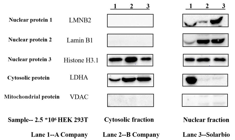 分别取等量的(2×106个)HEK 293T细胞,使用3种不同的试剂盒——A Company、B Company、Solarbio按照各自说明书进行胞浆胞核蛋白提取,使用3种不同的细胞核蛋白抗体进行WB检测,以核蛋白为检测指标的WB检测结果如图2所示。